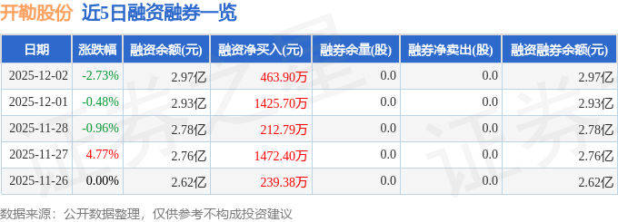 开勒股份融资融券信息显示,融资方面,当日融资买入2270.54万元,融资偿还1806.64万元,融资净买入463.9万元,连续3日净买入累计2102.39万元。融券方面,融券卖出0.0股,融券偿还0.0股,融券余量0.0股,融券余额0.0万元。融资融券余额2.97亿元。