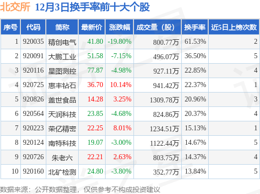 当日北交所换手率前10大个股中4只个股收涨,平均涨幅6.01%,其中精创电气(920035)以换手率61.53%排第一,8只个股近5个交易日中多次上榜。