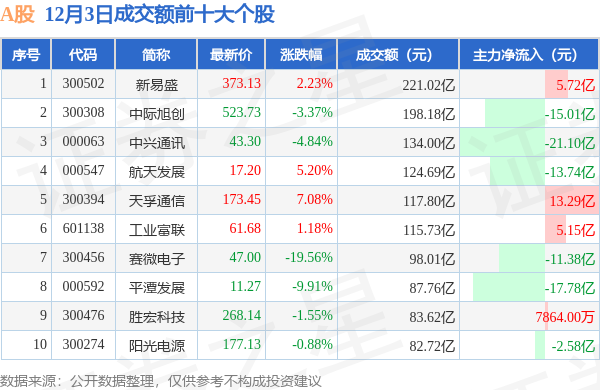 当日A股成交额前10大个股中4只个股收涨,平均涨幅3.92%,其中新易盛(300502)以成交额221.02亿元排第一。从主力资金流入看,成交额前10大个股中有4只个股呈现主力资金净流入。