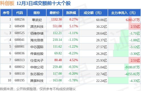 当日科创板成交额前10大个股中3只个股收涨,平均涨幅3.32%,其中寒武纪(688256)以成交额60.06亿元排第一。从主力资金流入看,成交额前10大个股中有3只个股呈现主力资金净流入。