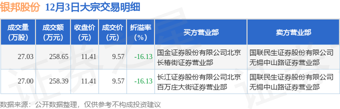 证券之星消息,12月3日银邦股份发生大宗交易,交易数据如下: