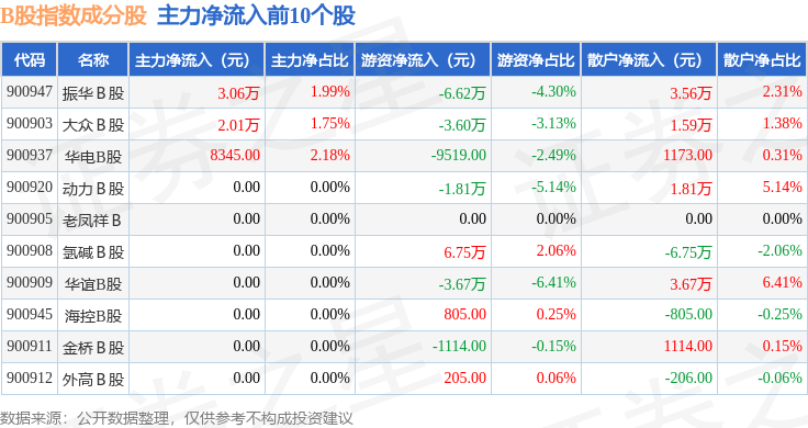 资金流向方面,B股指数(000003)成份股当日主力资金净流出合计34.54万元,游资资金净流出合计122.51万元,散户资金净流入合计157.05万元。成份股资金流向详情见下表:
