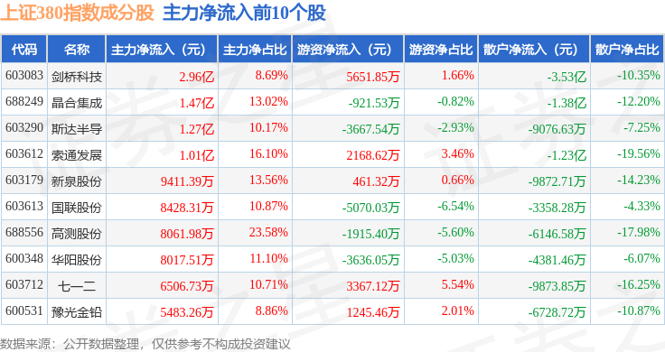 资金流向方面,上证380(000009)指数成份股当日主力资金净流出合计55.01亿元,游资资金净流入合计6.97亿元,散户资金净流入合计48.03亿元。成份股资金流向详情见下表: