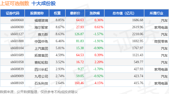证券之星消息,12月3日,上证可选(000035)指数报收于2953.43点,跌0.1%,成交210.8亿元,换手率0.85%。当日该指数成份股中,上涨的有23家,科沃斯以4.59%的涨幅领涨,下跌的有27家,广汽集团以3.38%的跌幅领跌。