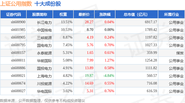 证券之星消息,12月3日,上证公用(000041)指数报收于2621.29点,涨0.32%,成交118.56亿元,换手率0.84%。当日该指数成份股中,上涨的有23家,京能电力以3.28%的涨幅领涨,下跌的有5家,上海电力以4.84%的跌幅领跌。