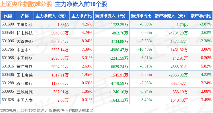 资金流向方面,上证央企(000042)指数成份股当日主力资金净流出合计33.54亿元,游资资金净流入合计9.79亿元,散户资金净流入合计23.75亿元。成份股资金流向详情见下表: