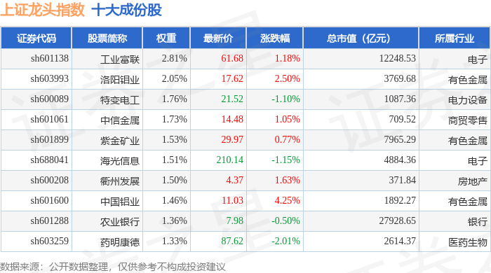 证券之星消息,12月3日,上证龙头(000065)指数报收于3542.2点,跌0.38%,成交1035.37亿元,换手率0.32%。当日该指数成份股中,上涨的有31家,中国铝业以4.25%的涨幅领涨,下跌的有62家,传音控股以8.23%的跌幅领跌。