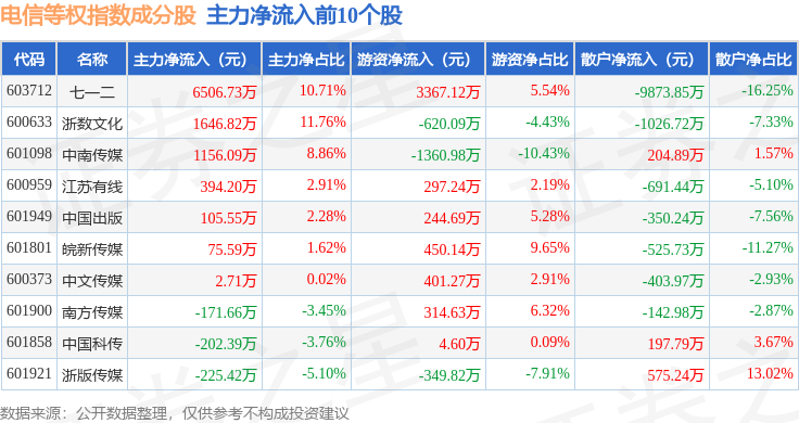 资金流向方面,电信等权(000078)指数成份股当日主力资金净流出合计11.87亿元,游资资金净流入合计5.39亿元,散户资金净流入合计6.48亿元。成份股资金流向详情见下表: