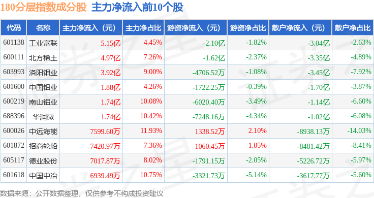 资金流向方面,180分层(000093)指数成份股当日主力资金净流出合计82.6亿元,游资资金净流入合计31.97亿元,散户资金净流入合计50.63亿元。成份股资金流向详情见下表:
