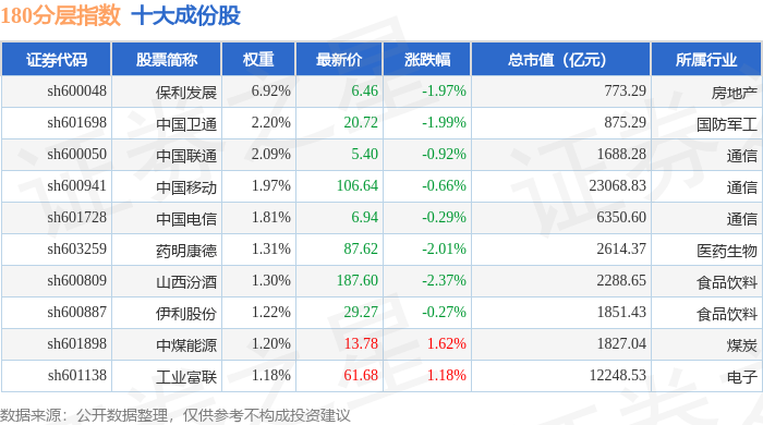 180分层(000093)指数十大成份股详情如下: