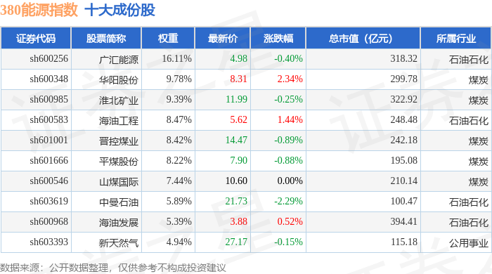 证券之星消息,12月3日,380能源(000104)指数报收于1302.03点,涨0.08%,成交26.08亿元,换手率0.83%。当日该指数成份股中,上涨的有6家,华阳股份以2.34%的涨幅领涨,下跌的有7家,中曼石油以2.29%的跌幅领跌。