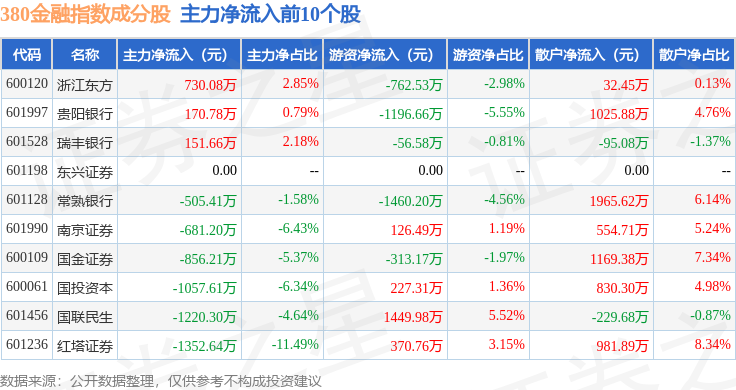 资金流向方面,380金融(000110)指数成份股当日主力资金净流出合计3.97亿元,游资资金净流入合计7239.91万元,散户资金净流入合计3.25亿元。成份股资金流向详情见下表: