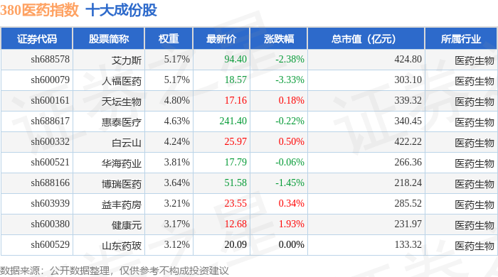 380医药(000109)指数十大成份股详情如下: