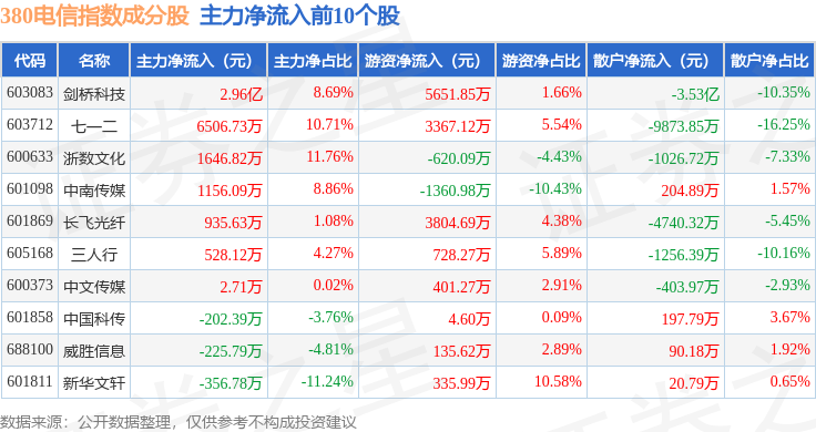资金流向方面,380电信(000112)指数成份股当日主力资金净流入合计9735.98万元,游资资金净流入合计1.87亿元,散户资金净流出合计2.85亿元。成份股资金流向详情见下表: