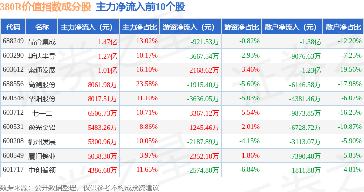 资金流向方面,380R价值(000120)指数成份股当日主力资金净流出合计42.23亿元,游资资金净流入合计5.52亿元,散户资金净流入合计36.7亿元。成份股资金流向详情见下表: