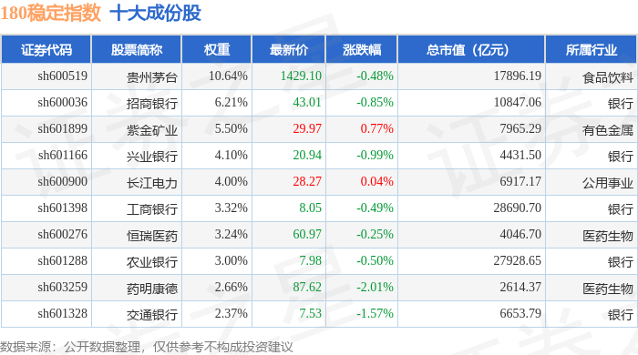 180稳定(000125)指数十大成份股详情如下: