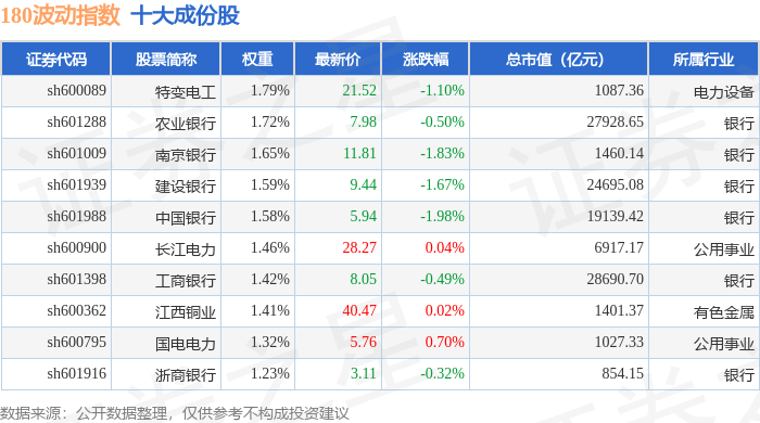 证券之星消息,12月3日,180波动(000129)指数报收于15379.47点,跌0.07%,成交710.37亿元,换手率0.28%。当日该指数成份股中,上涨的有41家,青岛港以2.11%的涨幅领涨,下跌的有53家,中国银行以1.98%的跌幅领跌。