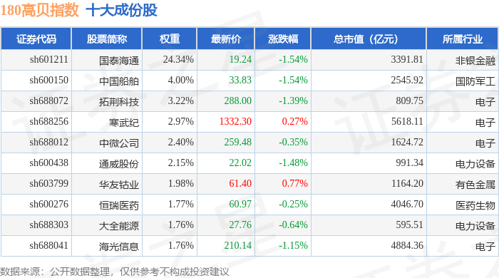 180高贝(000135)指数十大成份股详情如下: