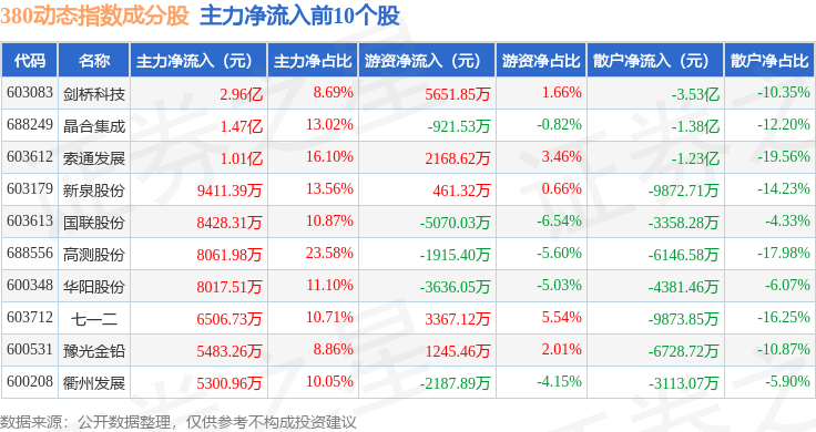 资金流向方面,380动态(000141)指数成份股当日主力资金净流出合计26.8亿元,游资资金净流入合计6.15亿元,散户资金净流入合计20.66亿元。成份股资金流向详情见下表: