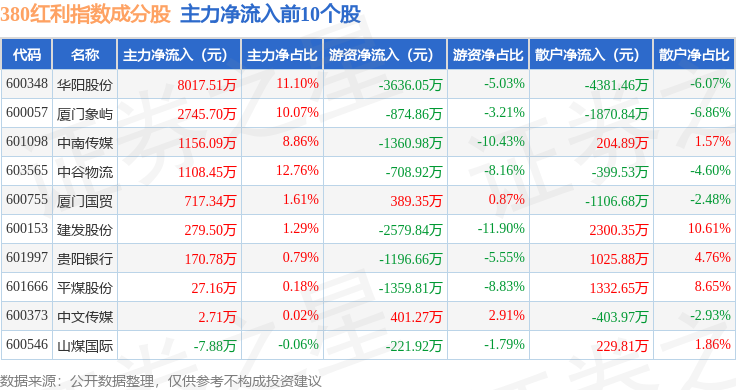 资金流向方面,380红利(000150)指数成份股当日主力资金净流出合计1.14亿元,游资资金净流出合计1.55亿元,散户资金净流入合计2.69亿元。成份股资金流向详情见下表:
