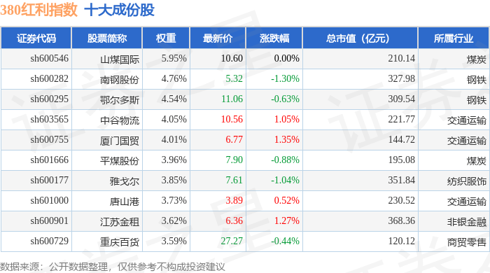 证券之星消息,12月3日,380红利(000150)指数报收于11793.71点,涨0.02%,成交53.29亿元,换手率0.82%。当日该指数成份股中,上涨的有10家,厦门象屿以3.69%的涨幅领涨,下跌的有19家,山东出版以2.19%的跌幅领跌。