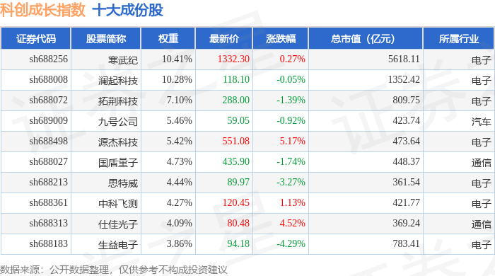 证券之星消息,12月3日,科创成长(000690)指数报收于1687.87点,跌0.77%,成交281.18亿元,换手率1.96%。当日该指数成份股中,上涨的有9家,东微半导以7.1%的涨幅领涨,下跌的有41家,敏芯股份以6.46%的跌幅领跌。