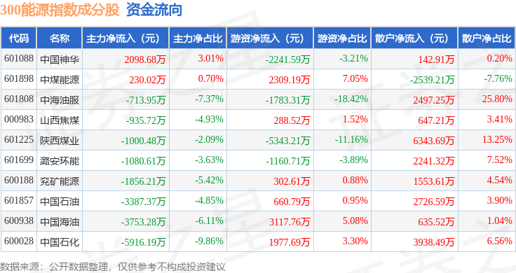 资金流向方面,300能源(000908)指数成份股当日主力资金净流出合计1.63亿元,游资资金净流出合计1872.26万元,散户资金净流入合计1.82亿元。成份股资金流向详情见下表: