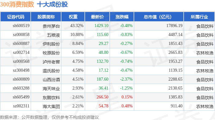 证券之星消息,12月3日,300消费(000912)指数报收于21578.59点,跌0.69%,成交120.35亿元,换手率0.38%。当日该指数成份股中,上涨的有2家,海大集团以0.48%的涨幅领涨,下跌的有15家,古井贡酒以4.84%的跌幅领跌。