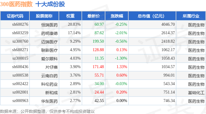 证券之星消息,12月3日,300医药(000913)指数报收于8366.82点,跌0.47%,成交123.08亿元,换手率0.51%。当日该指数成份股中,上涨的有11家,片仔癀以1.33%的涨幅领涨,下跌的有13家,百利天恒以2.1%的跌幅领跌。
