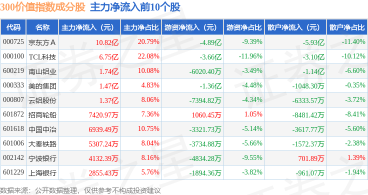 资金流向方面,300价值(000919)指数成份股当日主力资金净流出合计21.62亿元,游资资金净流入合计2.02亿元,散户资金净流入合计19.59亿元。成份股资金流向详情见下表: