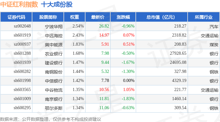 中证红利(000922)指数十大成份股详情如下: