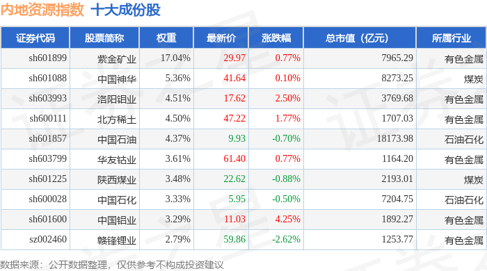 资金流向方面,内地资源(000944)指数成份股当日主力资金净流入合计1.32亿元,游资资金净流入合计2.68亿元,散户资金净流出合计4.0亿元。成份股资金流向详情见下表: