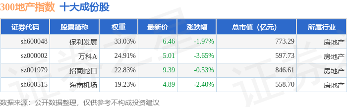 证券之星消息,12月3日,300地产(000952)指数报收于2560.09点,跌2.13%,成交32.46亿元,换手率1.46%。当日该指数成份股中,下跌的有4家,万科A以3.65%的跌幅领跌。