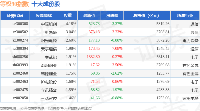 证券之星消息,12月3日,等权90(000971)指数报收于3276.83点,跌0.57%,成交2314.85亿元,换手率0.42%。当日该指数成份股中,上涨的有20家,天孚通信以7.08%的涨幅领涨,下跌的有69家,中兴通讯以4.84%的跌幅领跌。