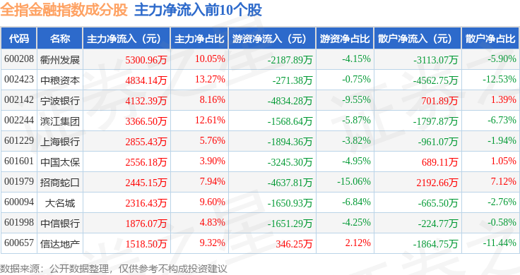 资金流向方面,全指金融(000992)指数成份股当日主力资金净流出合计62.23亿元,游资资金净流入合计16.56亿元,散户资金净流入合计45.68亿元。成份股资金流向详情见下表: