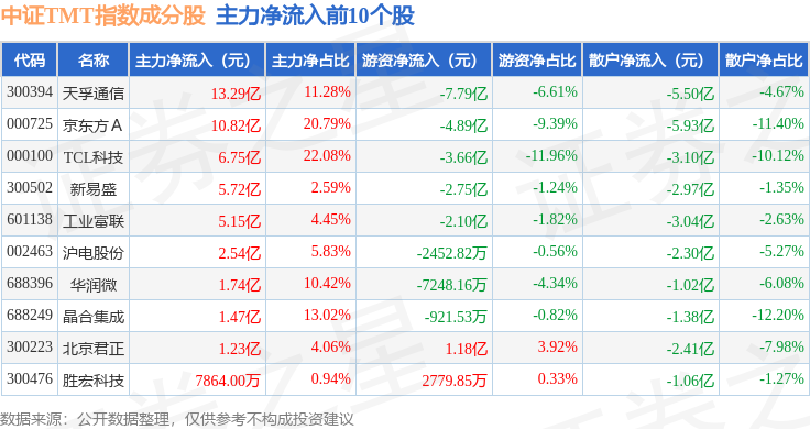 资金流向方面,中证TMT(000998)指数成份股当日主力资金净流出合计80.71亿元,游资资金净流入合计22.28亿元,散户资金净流入合计58.43亿元。成份股资金流向详情见下表:
