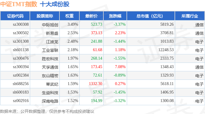 中证TMT(000998)指数十大成份股详情如下: