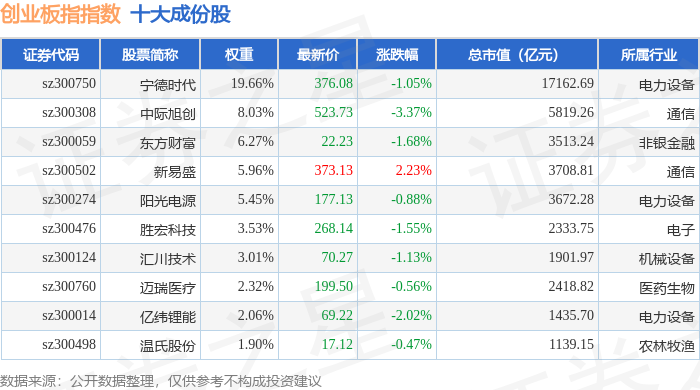 创业板指(399006)指数十大成份股详情如下: