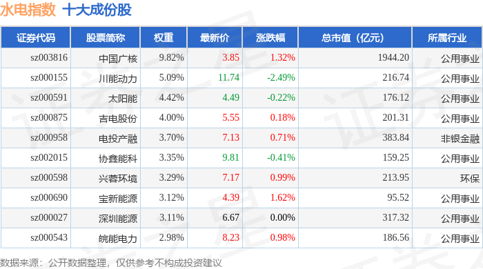 资金流向方面,水电指数(399234)成份股当日主力资金净流出合计5775.8万元,游资资金净流出合计8920.78万元,散户资金净流入合计1.47亿元。成份股资金流向详情见下表: