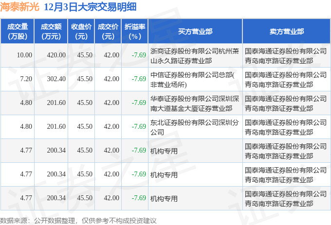 证券之星消息,12月3日海泰新光发生大宗交易,交易数据如下: