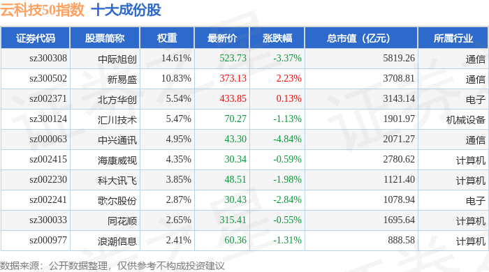 云科技50(399279)指数十大成份股详情如下: