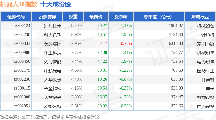 机器人50(399283)指数十大成份股详情如下: