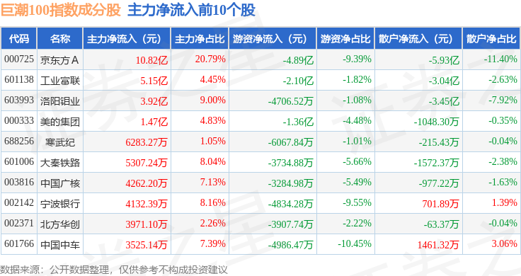 资金流向方面,巨潮100(399313)指数成份股当日主力资金净流出合计115.77亿元,游资资金净流入合计44.06亿元,散户资金净流入合计71.72亿元。成份股资金流向详情见下表: