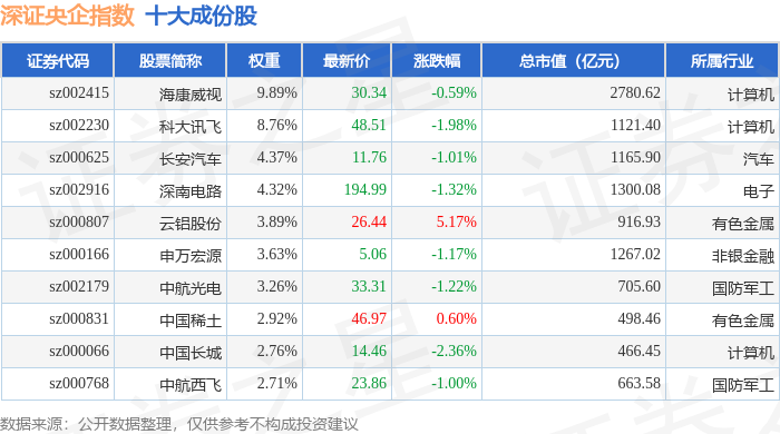 深证央企(399335)指数十大成份股详情如下:
