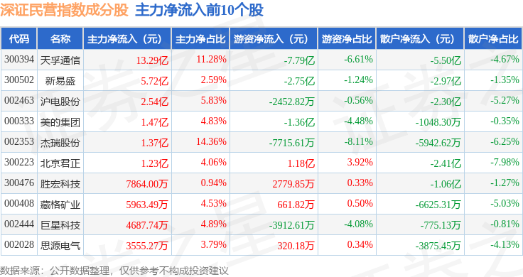 资金流向方面,深证民营(399337)指数成份股当日主力资金净流出合计100.0亿元,游资资金净流入合计20.49亿元,散户资金净流入合计79.5亿元。成份股资金流向详情见下表: