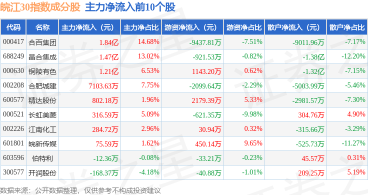 资金流向方面,皖江30(399350)指数成份股当日主力资金净流出合计14.78亿元,游资资金净流入合计2.0亿元,散户资金净流入合计12.78亿元。成份股资金流向详情见下表: