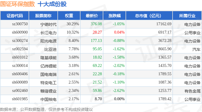 证券之星消息,12月3日,国证环保(399358)指数报收于5454.75点,跌0.93%,成交453.15亿元,换手率0.63%。当日该指数成份股中,上涨的有10家,桂冠电力以1.85%的涨幅领涨,下跌的有28家,晶科能源以2.86%的跌幅领跌。