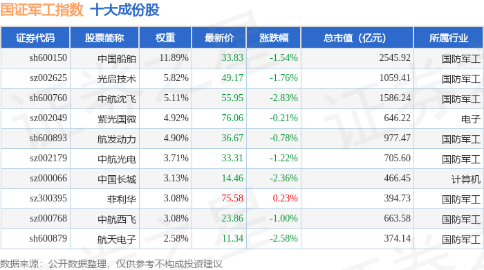 国证军工(399368)指数十大成份股详情如下: