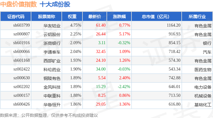证券之星消息,12月3日,中盘价值(399375)指数报收于5719.62点,涨0.53%,成交428.97亿元,换手率1.08%。当日该指数成份股中,上涨的有56家,云铝股份以5.17%的涨幅领涨,下跌的有42家,环旭电子以3.53%的跌幅领跌。