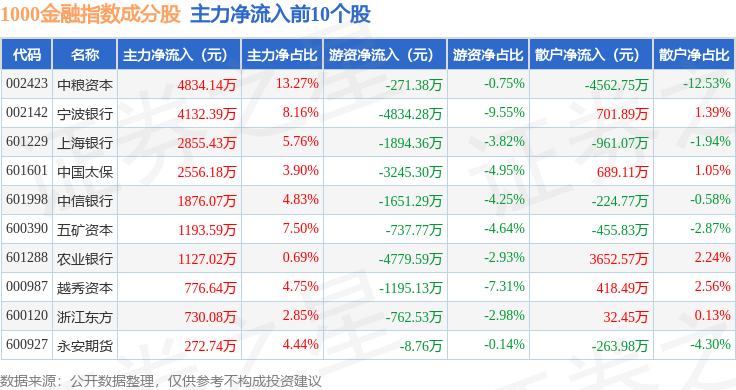 资金流向方面,1000金融(399387)指数成份股当日主力资金净流出合计50.64亿元,游资资金净流入合计16.43亿元,散户资金净流入合计34.21亿元。成份股资金流向详情见下表: